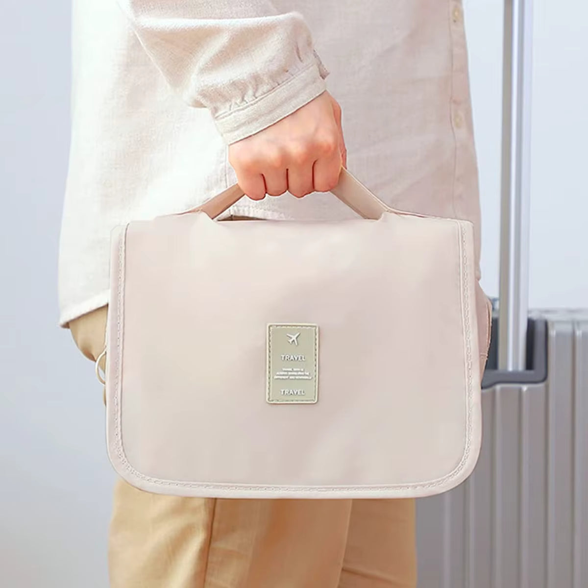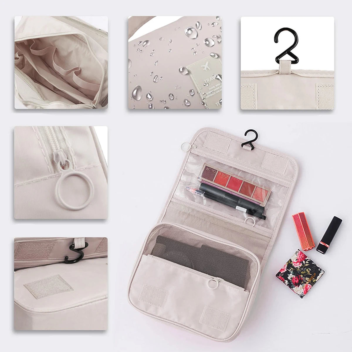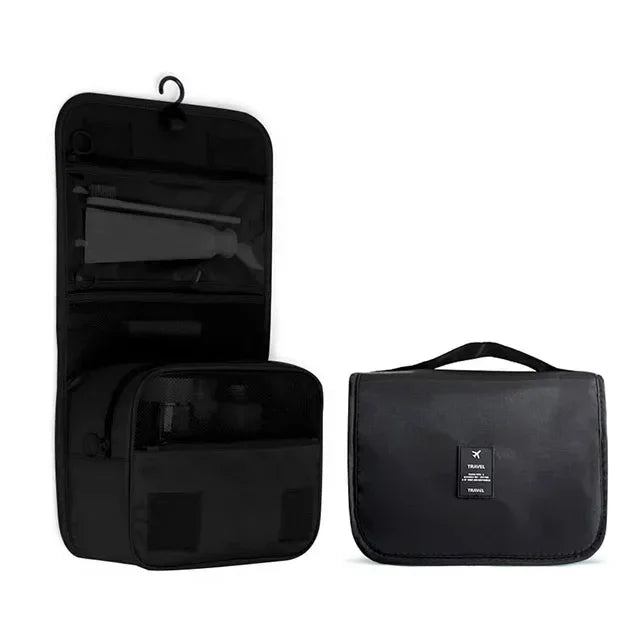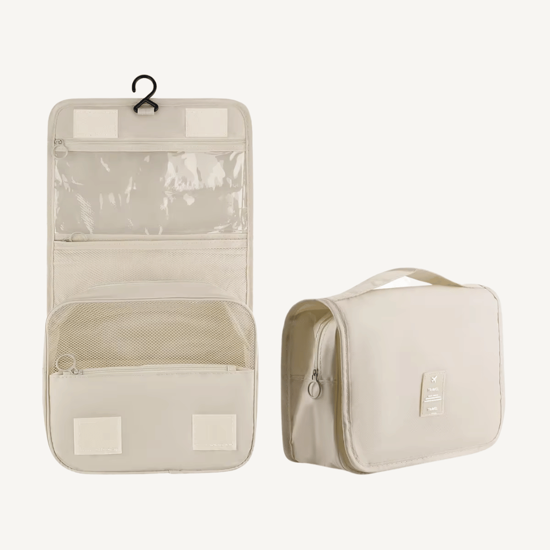 Travelia™ es un neceser de viaje con diseño colgante y múltiples compartimentos, pensado para organizar cosméticos, artículos de higiene y accesorios personales. Su estructura permite ver y acceder fácilmente a cada producto, manteniendo todo ordenado y protegido durante el viaje.